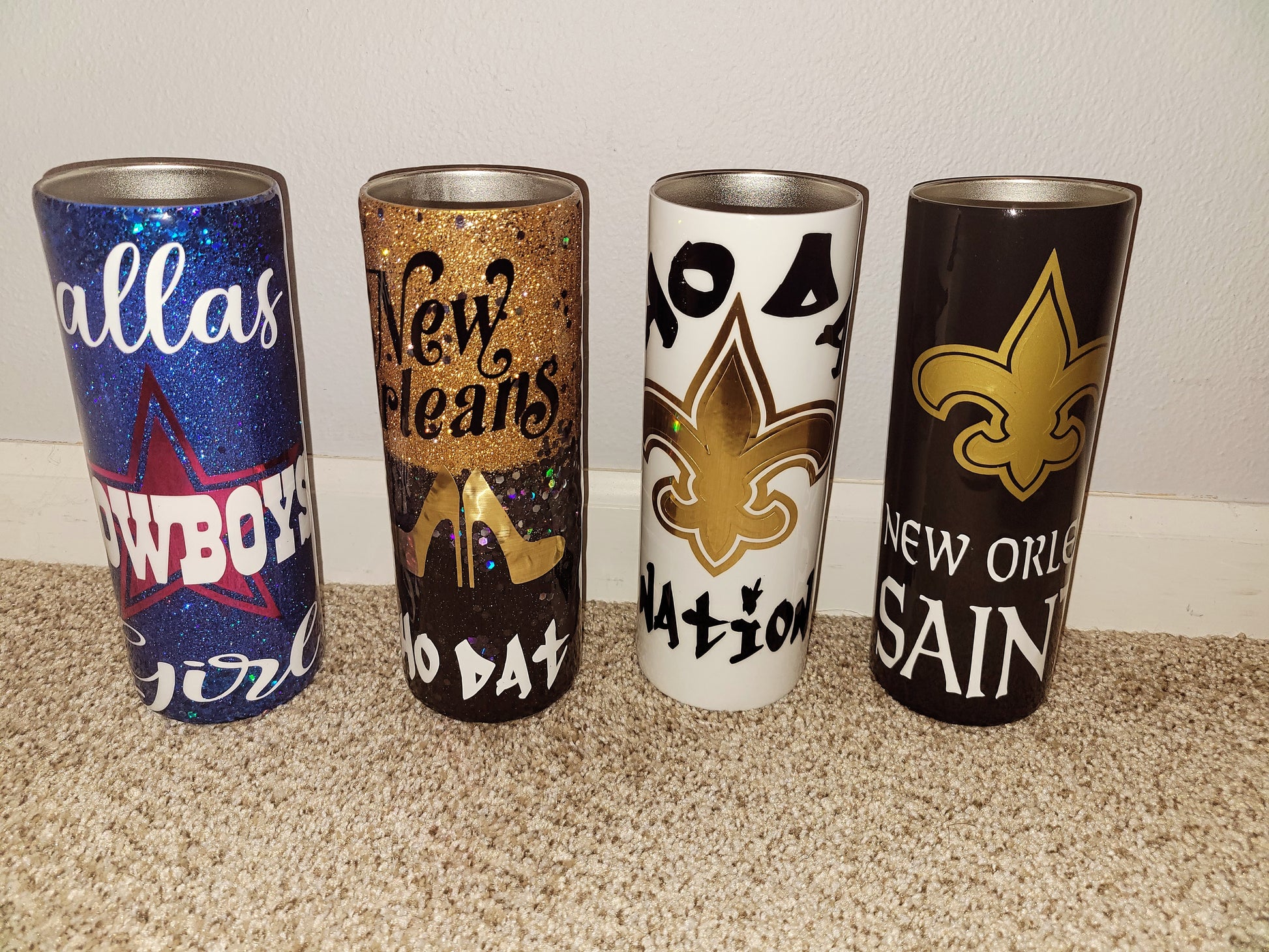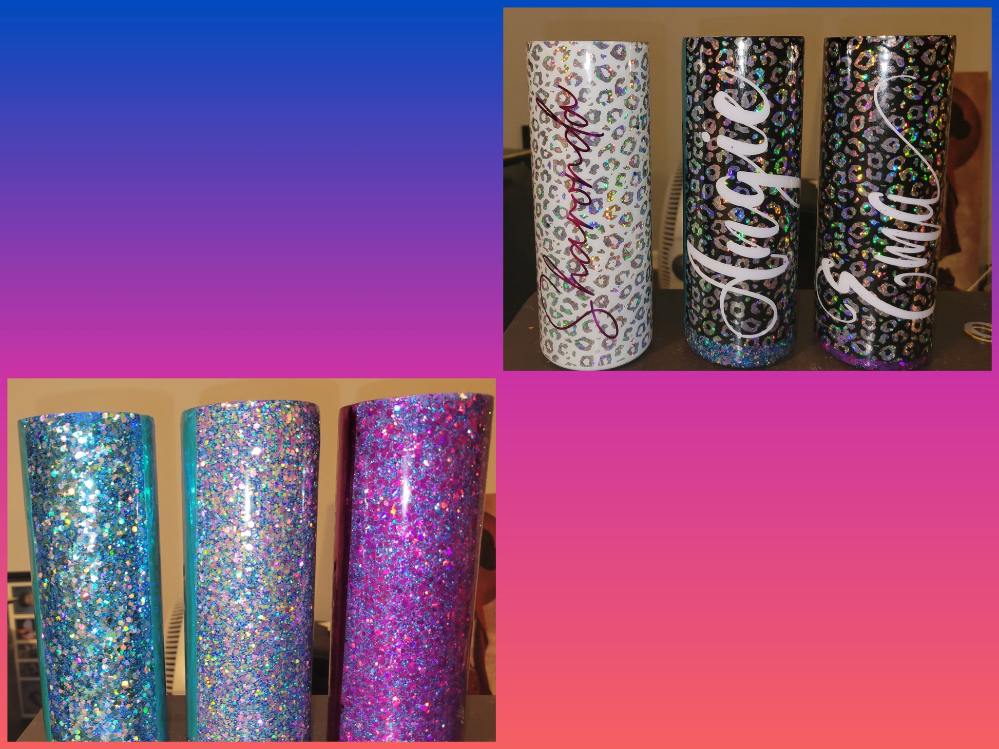 Tumblers are made using glitter, epoxy, vinyl, and UV DTF.